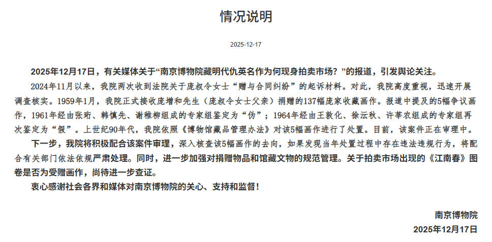 2024年11月以来,南京博物院两次收到法院关于庞叔令女士“赠与合同纠纷”的起诉材料。对此,南京博物院高度重视,迅速开展调查核实。1959年1月,南京博物院正式接收庞增和先生(庞叔令女士父亲)捐赠的137幅庞家收藏画作。报道中提及的5幅争议画作,1961年经由张珩、韩慎先、谢稚柳组成的专家组鉴定为“伪”;1964年经由王敦化、徐沄秋、许莘农组成的专家组再次鉴定为“假”。上世纪90年代,南京博物院依照《博物馆藏品管理办法》对该5幅画作进行了处置。目前,该案件正在审理中。